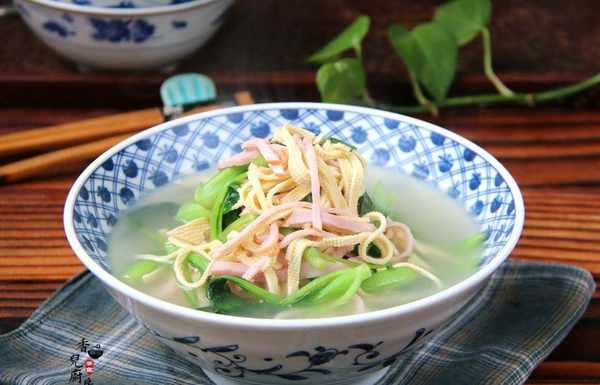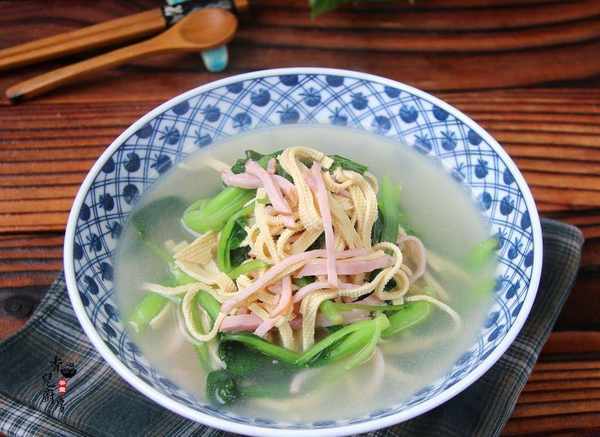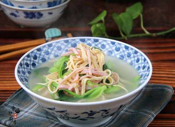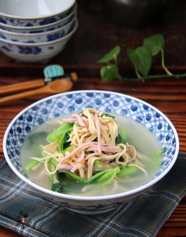 推薦給大傢這道湯,上湯雞毛菜火腿幹絲,是用當季的雞毛菜,薄百葉以及即食的火腿片搭配一起烹制而成的,做法簡單快速,看似湯汁清淡,味道卻鮮美無比。