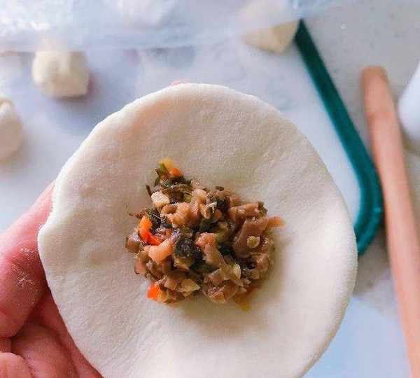 第9步、放入梅幹菜,開始捏褶子。