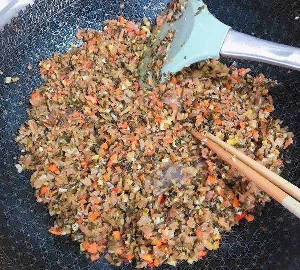 第7步、梅幹菜臘肉餡兒提前炒好放涼。