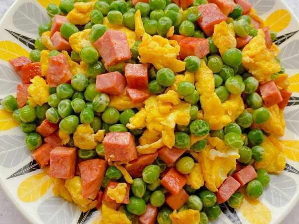 1.豌豆清洗幹凈,然後起鍋燒水,水燒開以後,加入適量的花生油和食鹽同煮,接著放入豌豆焯煮三分鐘,再撈出瀝幹水分備用。