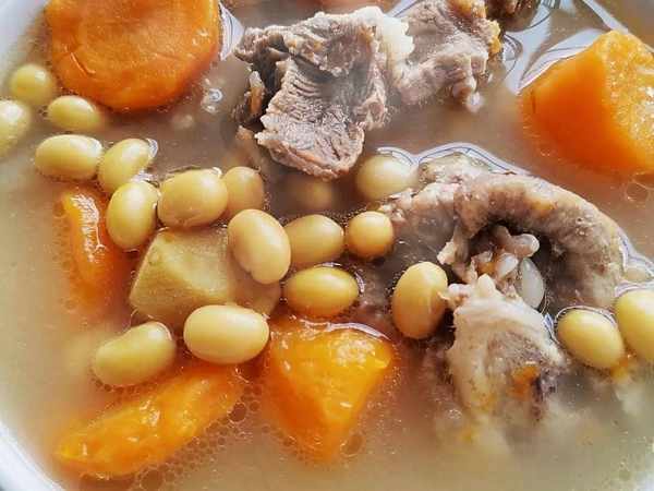 食材準備:筒骨、黃豆、胡蘿卜、薑片、蔥段。