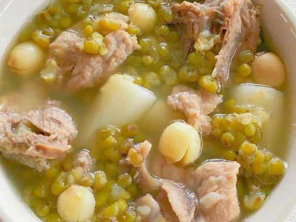 食材準備:排骨、綠豆、蓮子、山藥、薑片、蔥段。