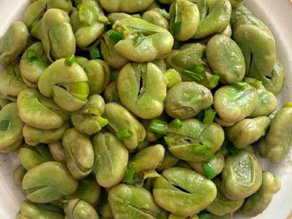 1.蠶豆清洗幹凈,然後在黑眉處剪開,接著熱鍋燒油,油熱以後,放入蠶豆爆炒,炒出香味後,加入適量的食鹽調味,繼續翻炒均勻。