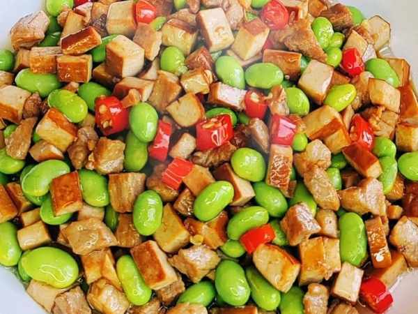 食材準備:毛豆、香幹、瘦肉、小米辣、蒜末。
