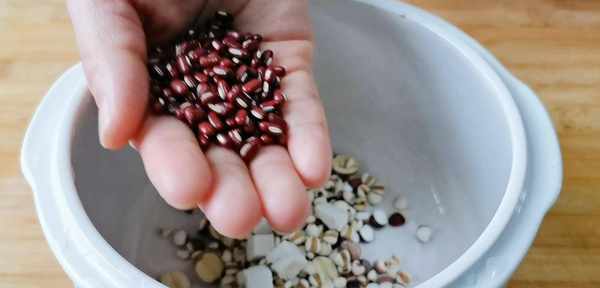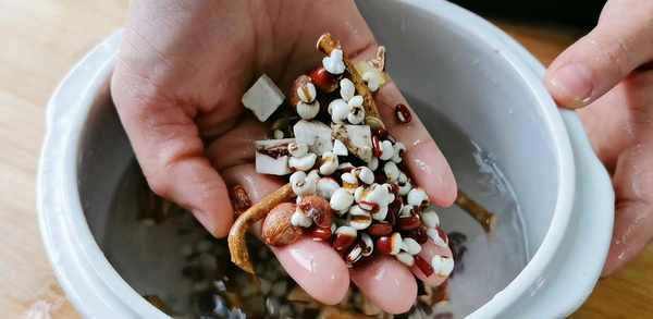 2.我們再把適量的芡實,茯苓,五指毛桃根,茯苓用清水清洗幹凈備用然後放入燉盅中,將炒過的薏米也放入燉盅中,薏米和赤小豆是祛濕的黃金搭配,茯苓可以健脾和胃,祛濕,芡實可以強身健體,尤其是五指毛桃根益氣健脾,祛濕潤肺,自帶淡淡的椰香味,我們廣東人最喜歡用它來搭配煲祛濕湯