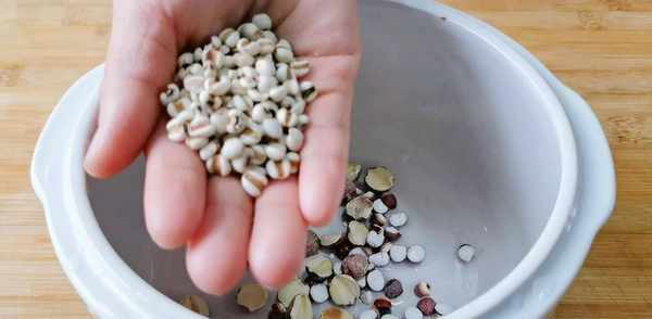 1.首先我們準備適量的薏米清洗幹凈,然後放進平底鍋翻遍一下,翻炒至薏米表面微微泛黃,聞著有焦香味即可,薏米比較寒涼,翻炒下才能發揮它祛濕的作用