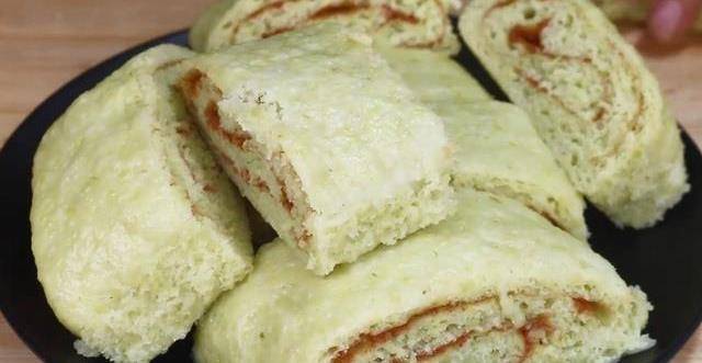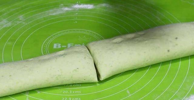 9.時間到,將面卷拿出來,放在案板上,用菜刀將它切成小塊的,就可以裝進盤子裡,端上桌和傢人一起分享瞭。一個美味的毛豆面卷就做好瞭。它聞起來有一股毛豆的清香,非常適合當做早餐來吃。趕緊來試試吧!