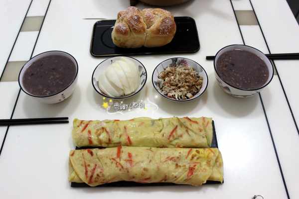 四:胡蘿蔔卷餅+麵包+黑米粥+梨子