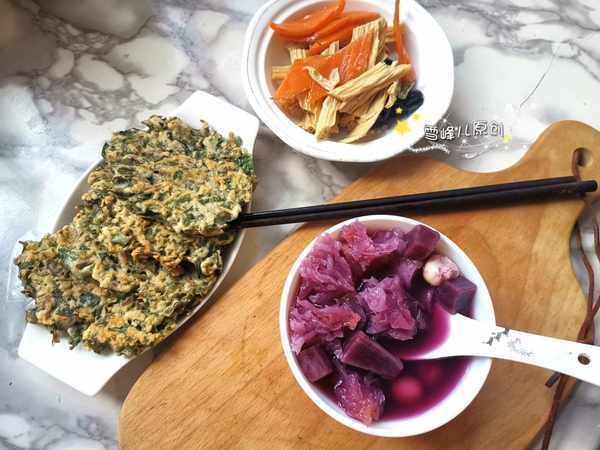 這一組早餐,紫薯銀耳羹用電鍋預約和拌腐竹,食材汆燙拌一下即可都很簡單,我們就著重說一下雞蛋菜餅的做法。