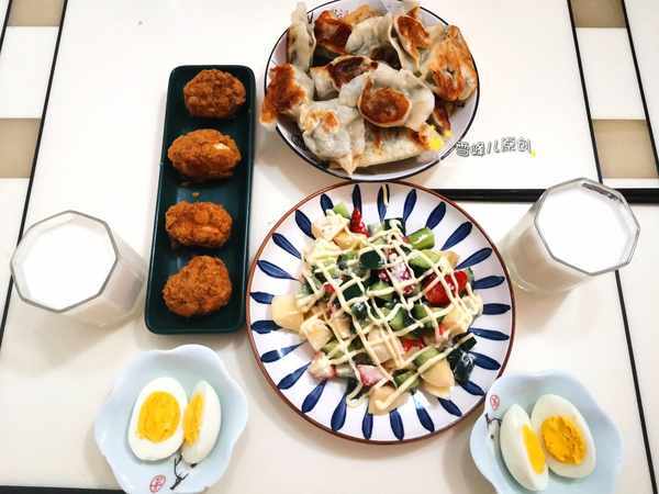 這一組早餐,也屬於中西結合的類型,中式的煎餃,配上西式的肉鬆小貝和沙律,在配上鈣含量滿滿的牛奶,大人孩子各取所需。