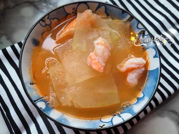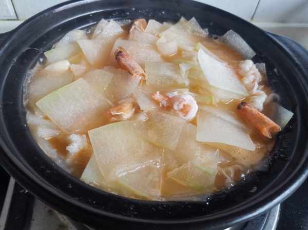 第五步:把冬瓜片倒入,大火燒開,改成小火慢慢燉大約8分鐘,加入蝦仁煮2分鐘。