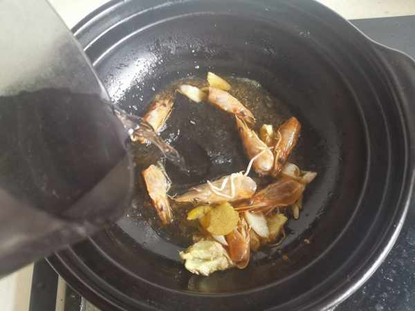 第三步:可幹燒砂鍋放入少許花生油,把蝦頭放入炒出紅油,放入葱薑炒香。