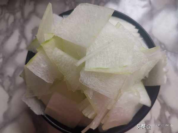 第一步:冬瓜去皮切片備用。冬瓜微寒,有一定的寒凉之氣,做成冬瓜湯富含水分,可以緩解體內燥熱之氣,並且降低肺熱,有清熱去燥、緩解肺熱咳嗽的作用。而冬瓜中含有一定的丙醇二酸,有很好的抑制糖類轉化為脂肪的作用,降脂减肥很棒。冬瓜是秋季上市,遇到了就多買一些,秋天很適合多吃。