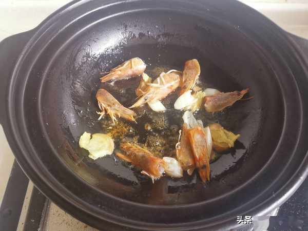第三步:可幹燒砂鍋放入少許花生油,把蝦頭放入炒出紅油,放入葱薑炒香。