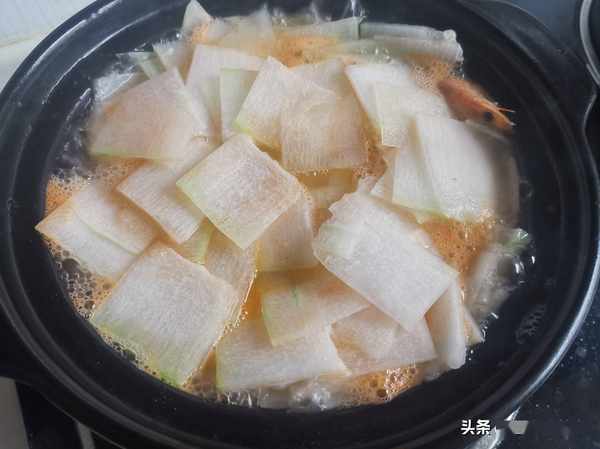第五步:把冬瓜片倒入,大火燒開,改成小火慢慢燉大約8分鐘,加入蝦仁煮2分鐘。