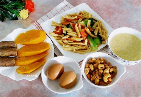 如面包、粥、面條、包子、煎餅等,也可以是土豆和紅薯之類。