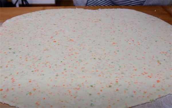 5.現在面團餳好瞭,撒一些幹粉防粘,用搟面杖搟開,搟成一張大的餅皮。