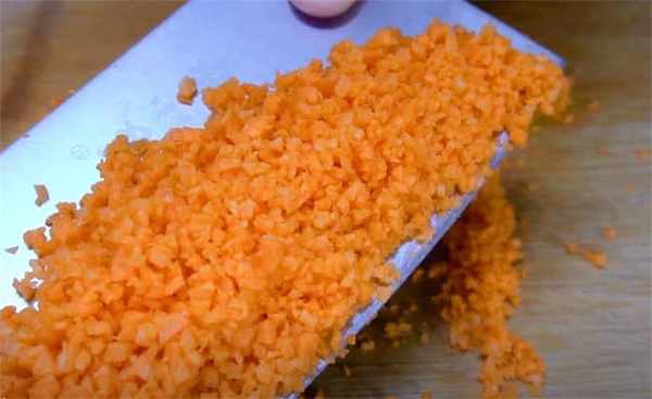 2.現在我們來切點胡蘿卜,切成這樣的小丁,這裡一定要切的小一些,非常關鍵。