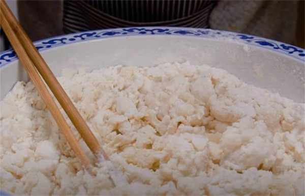 1.準備300g的普通面粉,用200毫升的開水燙面,攪成面絮,在旁邊晾一晾。