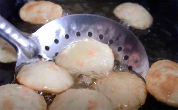 8.油溫四五成熱的時候下入餅胚,用漏勺按一下這個泡會鼓的厲害一些。