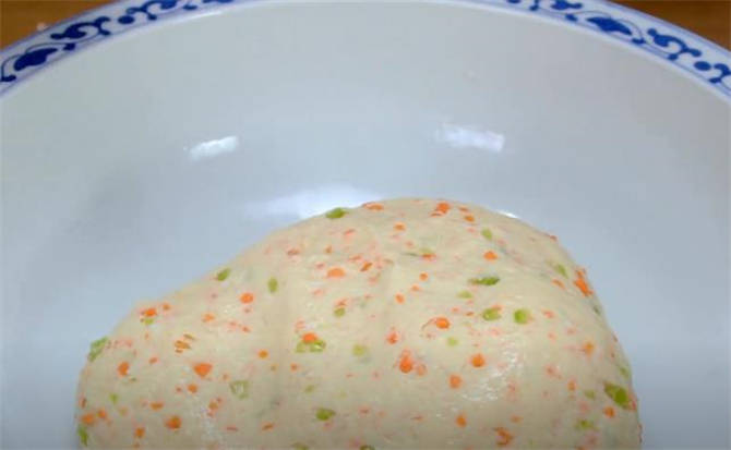 4.面粉裡放一些胡蘿卜,青椒,15g食用油,5g的食鹽調味,下手揉成面團,最後揉成一個光滑偏軟的面團,封上保鮮膜餳上十分鐘。