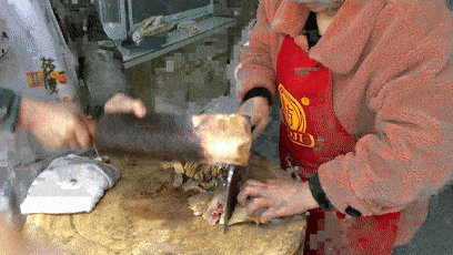 當地土雞煮熟晾涼,一人拿刀,一人持木棒敲擊,用一敲一切的方式,可以切出盡量薄的雞肉片,且皮肉不離。