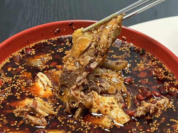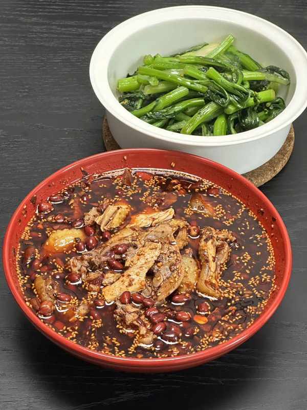 棒棒雞按老板的介紹是不用加熱,雞肉+雞高湯+紅油辣子混合拌勻,最後撒上炸花生米就可以吃瞭。(但我試瞭直接拌和雞肉過沸水加熱下,兩者其實口感沒差)