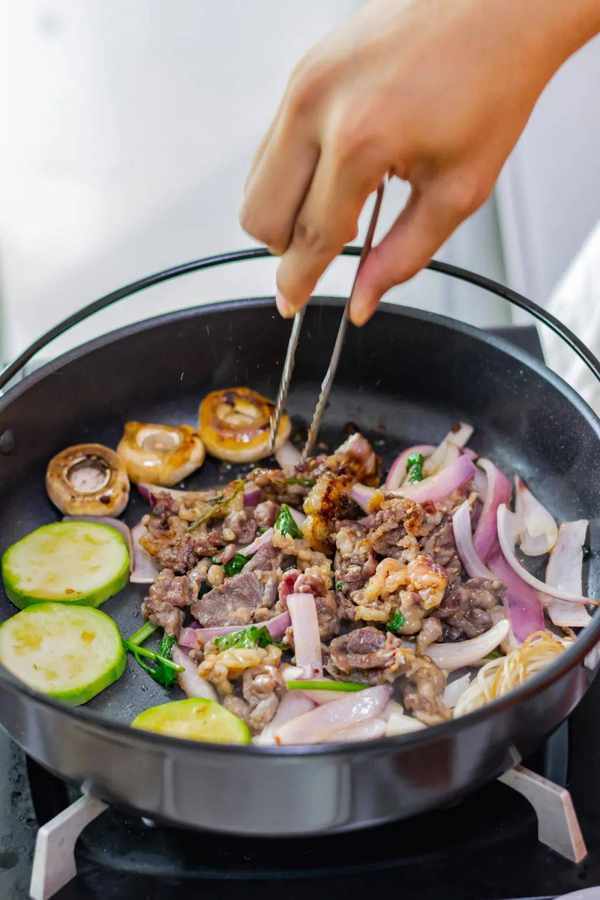 牛油蹭鍋,拌好的牛肉直接上鍋,烤得滋滋冒油,肉嫩邊焦就能吃瞭。