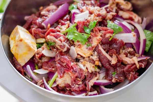 齊齊哈爾當地的烤肉比較豪邁,新鮮牛肉切大塊,和調料一起放不銹鋼盆裡抓勻。
