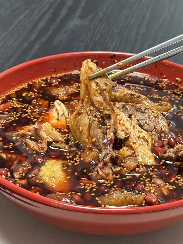切好的雞肉澆上雞湯,再淋上靈魂紅油辣子,讓雞肉在裡頭浸泡入味就能吃瞭,是當地一絕的美味。