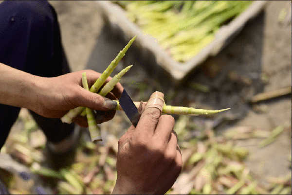 在經過每日上千次的尋找、彎腰、徒手采摘、剝皮等步驟之後,這些鮮筍再在幾個小時的徒步運輸後,才會送到收筍人的手中。