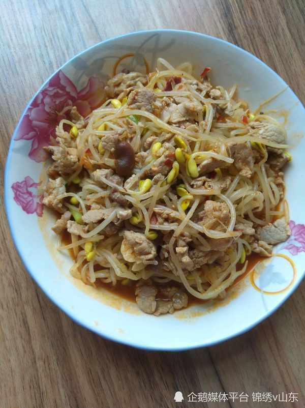 材料: 豬肉150克,豆芽300克,蔥薑蒜適量,生抽、鹽、糖、料酒、雞精適量。