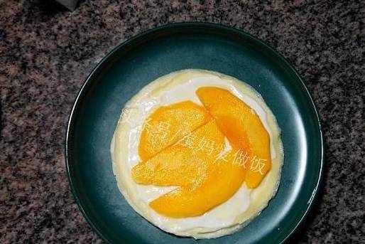繼續蓋上一張餅皮,抹酸奶;不需要每張餅皮上都放芒果片,隔2、3張再放一層芒果片就可以瞭。