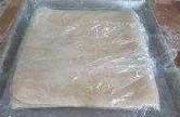 4、立即攤成大片,放入撒粉的淺盤中,蓋上保鮮膜,入冰箱冷凍1小時;