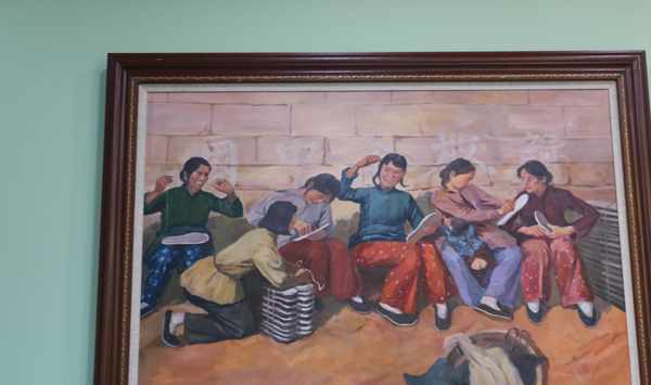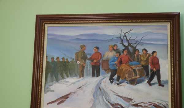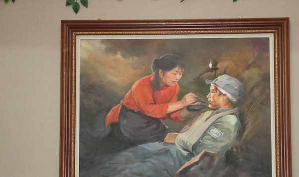 這是“紅嫂廳”,墻壁上懸掛著的油畫,展現瞭沂蒙紅嫂救傷員的感人畫面,讓人仿佛走人那戰火紛飛的時代,倍感今天幸福生活的來之不易!