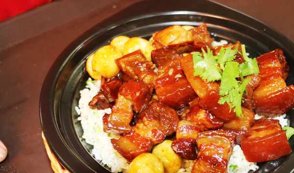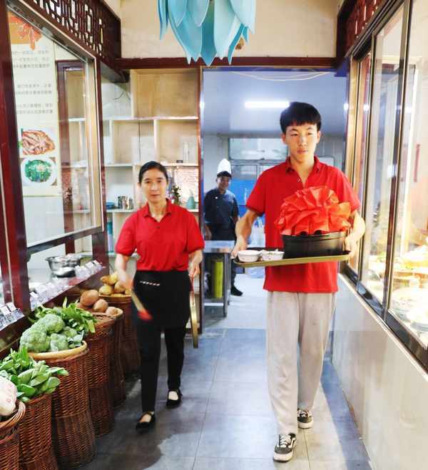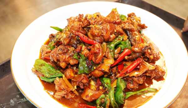 這是店裡的招牌菜“紅嫂生態炒雞”,選料考究,選用當地一年生黑爪小公雞,皮薄辣脆的皺皮辣椒、鐵桿大蔥,秘制醬料生炒而成。其色澤紅亮,味鮮辣香,讓人吃起來欲罷不能!