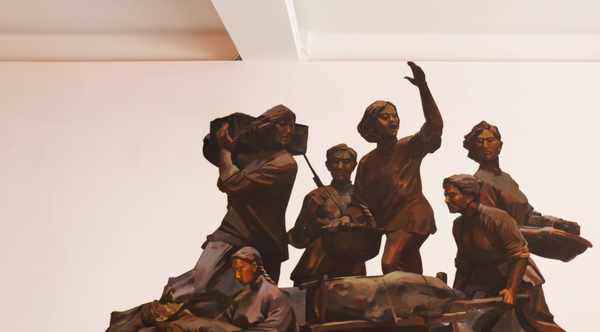這是“初心廳”,展現瞭沂蒙人民送兒去參軍,婦女推著軍糧上戰場的生動畫面,詮釋瞭沂蒙人民“愛黨愛軍、無私奉獻”的精神。