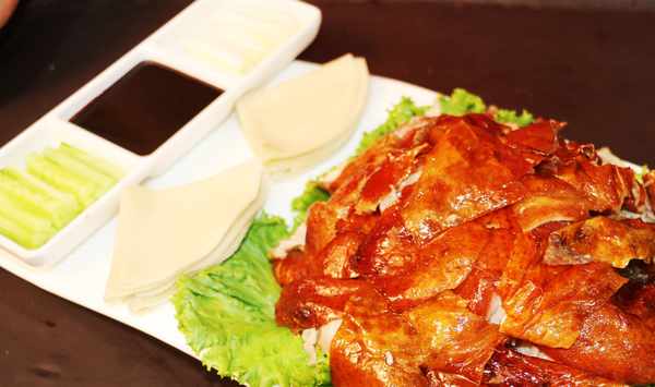 這是北京烤鴨,外皮酥脆,肉質鮮嫩。不到北京,在沂蒙紅嫂傳呈酒店,就能吃到味道純正的烤鴨。