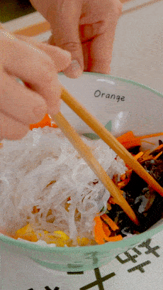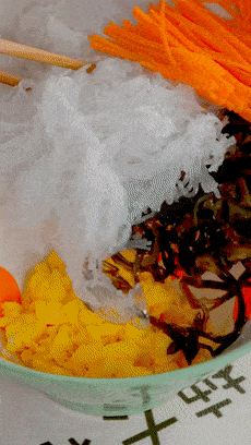炒好的蛋碎裡,加上冬粉、木耳絲、胡蘿卜絲、1勺醬油、1勺素蠔油、鮮菇粉、鹽、蔥花和油,調味不用太重口瞭,這樣就剛剛好。