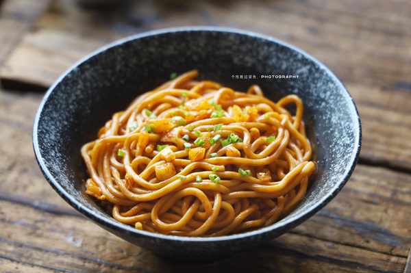 6.面條上點綴著綠油油的蔥花,真是看瞭就讓人垂涎三尺。面條裹滿瞭醬汁,吃熱幹面比較幹,最好配碗湯,一起搭配吃。