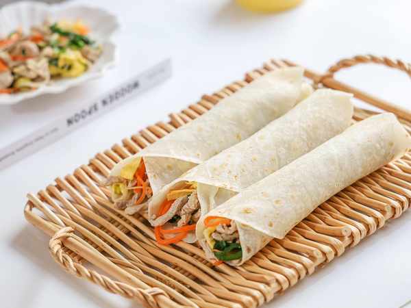 1.面粉200克加入剛剛燒開的開水120克,一邊倒一邊攪拌成絮狀。 用開水燙面是為瞭破壞面粉的筋,這樣做出來的卷餅會更煊軟