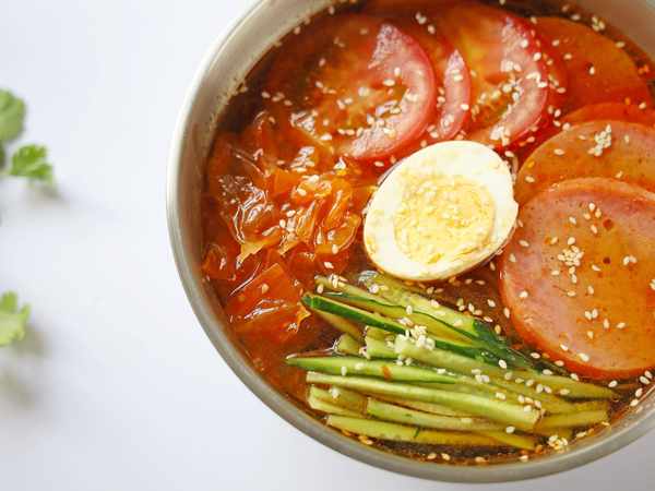 4.鍋中燒水,水開後下冷面,煮2分鐘撈出過冷水,讓面更加Q彈
