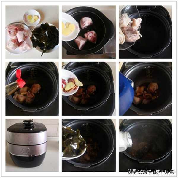 小貼士:1. 蹄花放入冷水鍋中焯出血沫, 加入些薑片和料酒去腥; 2. 將焯好的蹄花放入電燉鍋中, 加入薑片、八角等大料和老抽等調味料,少許水,按下電燉鍋上燉煮蹄花的功能鍵; 3. 喜歡海帶軟爛的可以先將海帶和蹄花一起燉煮,如果喜歡稍微硬的口感, 就待蹄花快要好後加入海帶燉煮十分鐘左右即可, 燉煮好後加入鹽等調味。