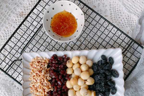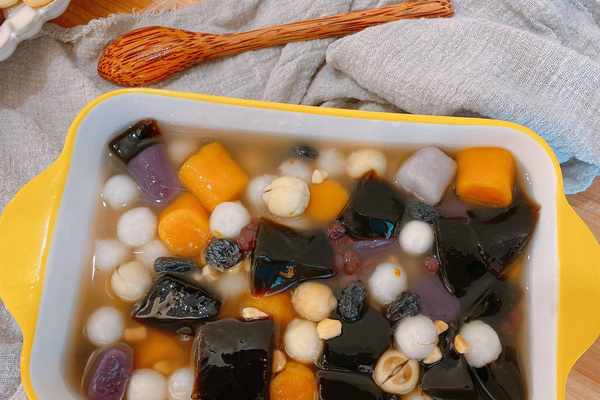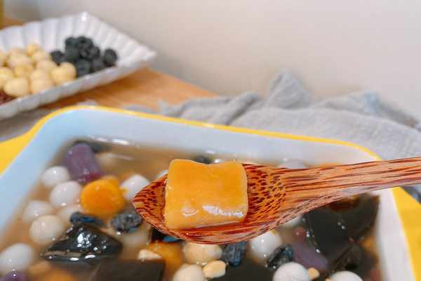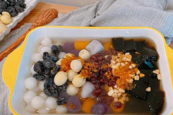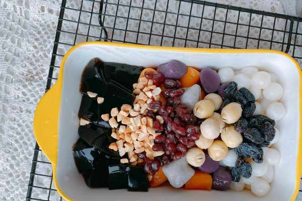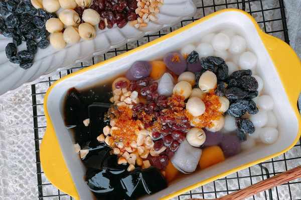 【原材料】芋圓、小圓子、龜苓膏粉、蓮子、蜜紅豆、葡萄幹、花生碎、桂花蜜;