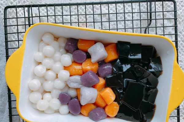 7、這時候就可以開始裝盤瞭,把芋圓、小丸子和龜苓膏分別裝在盤中,然後在上面放上配料,澆上桂花蜜,倒上冰牛奶或者冰水,好喝的冷飲拼盤就做好瞭;