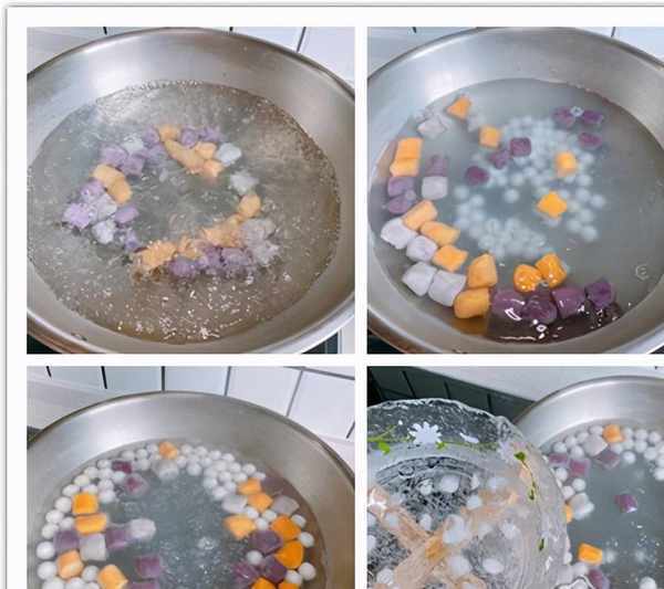 4、鍋中燒水,水開之後加入芋圓,芋圓個頭大,比小圓子難煮熟一些,煮到水開之後加入小圓子一起煮,煮到芋圓和小圓子的體積明顯變大,漂浮在水面,說明煮熟瞭;