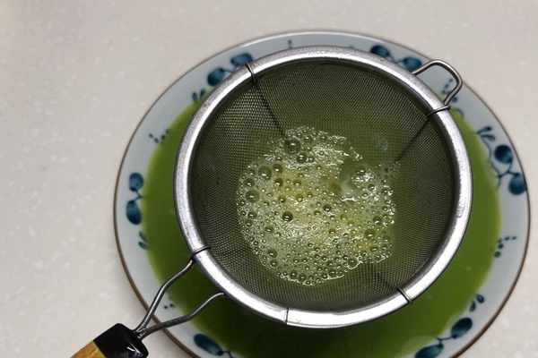 4、用過篩網過濾一下我們剛才攪拌好的菠菜雞蛋液,可以去掉表面上的氣泡,關鍵的是這一部也是為瞭讓後面蒸出來的雞蛋羹口感更加的嫩滑。要是不介意口感的話,可以自動忽略這一步。