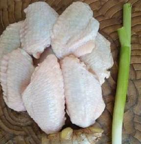 將泡好的雞翅瀝幹水分,可以用廚房紙巾吸幹水分,將蔥切段,將生薑切片!