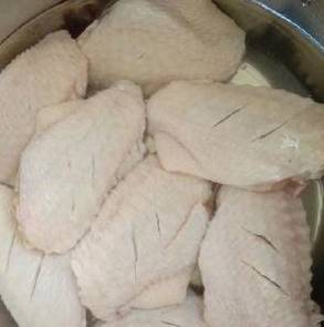 將雞翅改刀,用小刀子在雞翅上面劃上幾刀,因為一會要油炸,防止內部受熱而無法發泄,然後在水中浸泡20分鐘