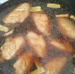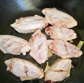 起油鍋下入薑片,待油溫稍微升起的時候,就可以下入雞翅瞭!